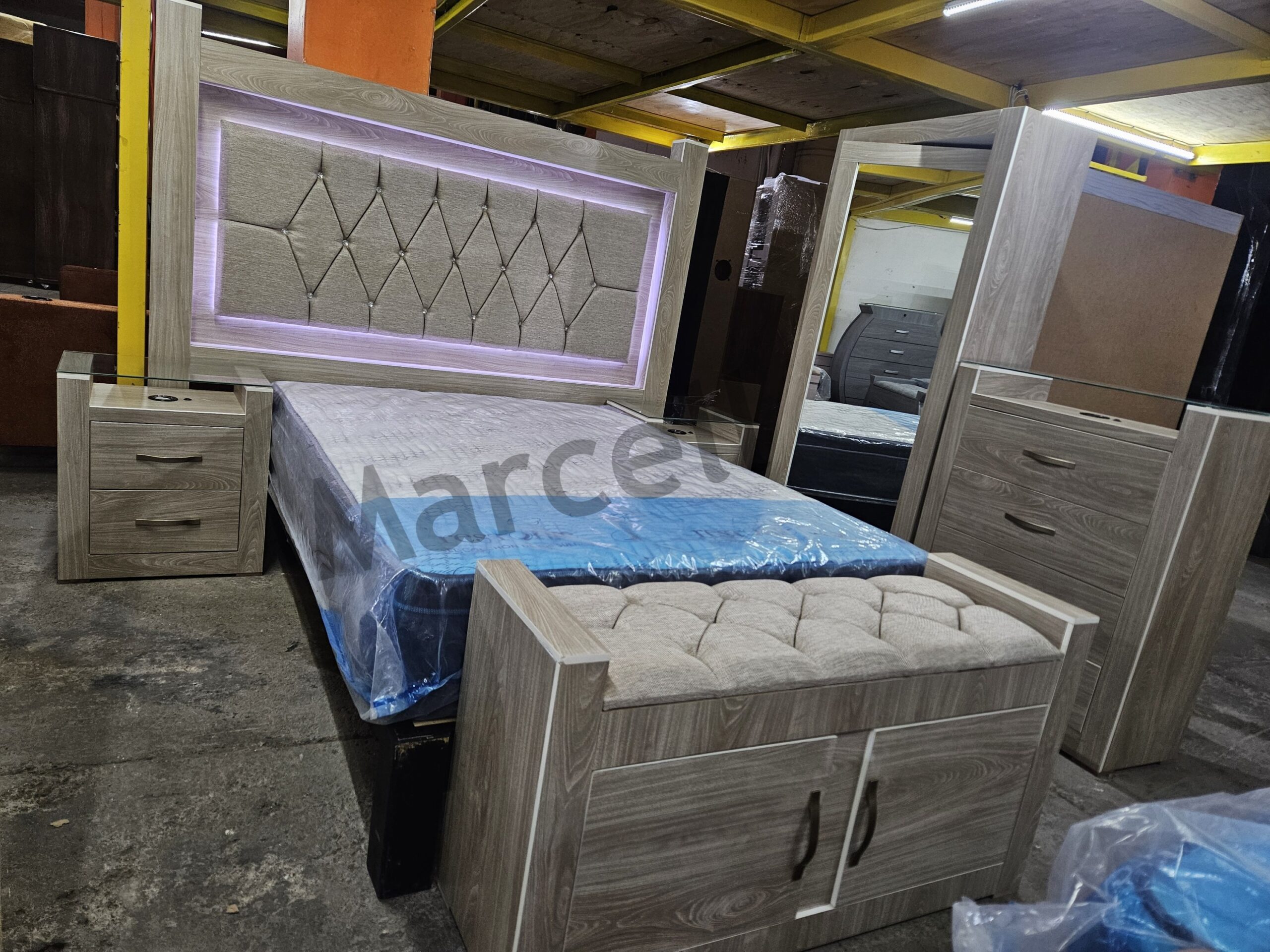 Recámara tamaño estándar para king size, queen y matrimonial. Incluye cabecera con luz led, par de buros y cajonera con cubiertas de cristal, espejo giratorio de cuerpo completo y baúl.