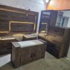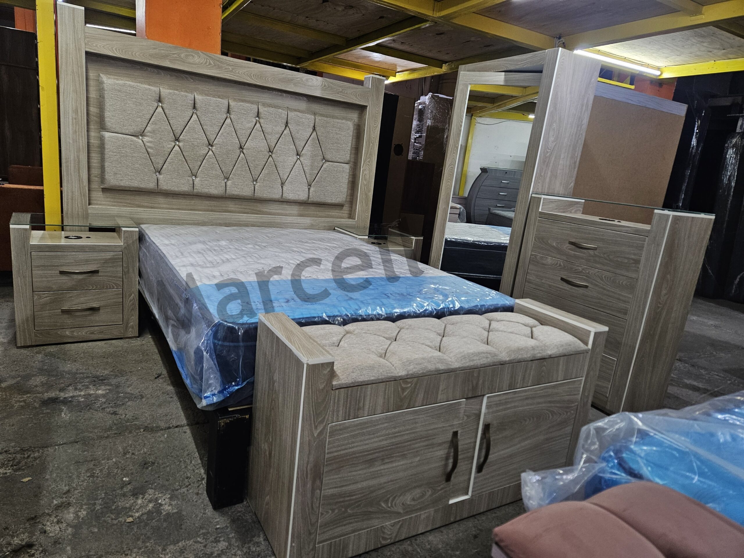 Saltar al contenidoRecámara tamaño estándar para king size, queen y matrimonial. Incluye cabecera con luz led, par de buros y cajonera con cubiertas de cristal, espejo giratorio de cuerpo completo y baúl.