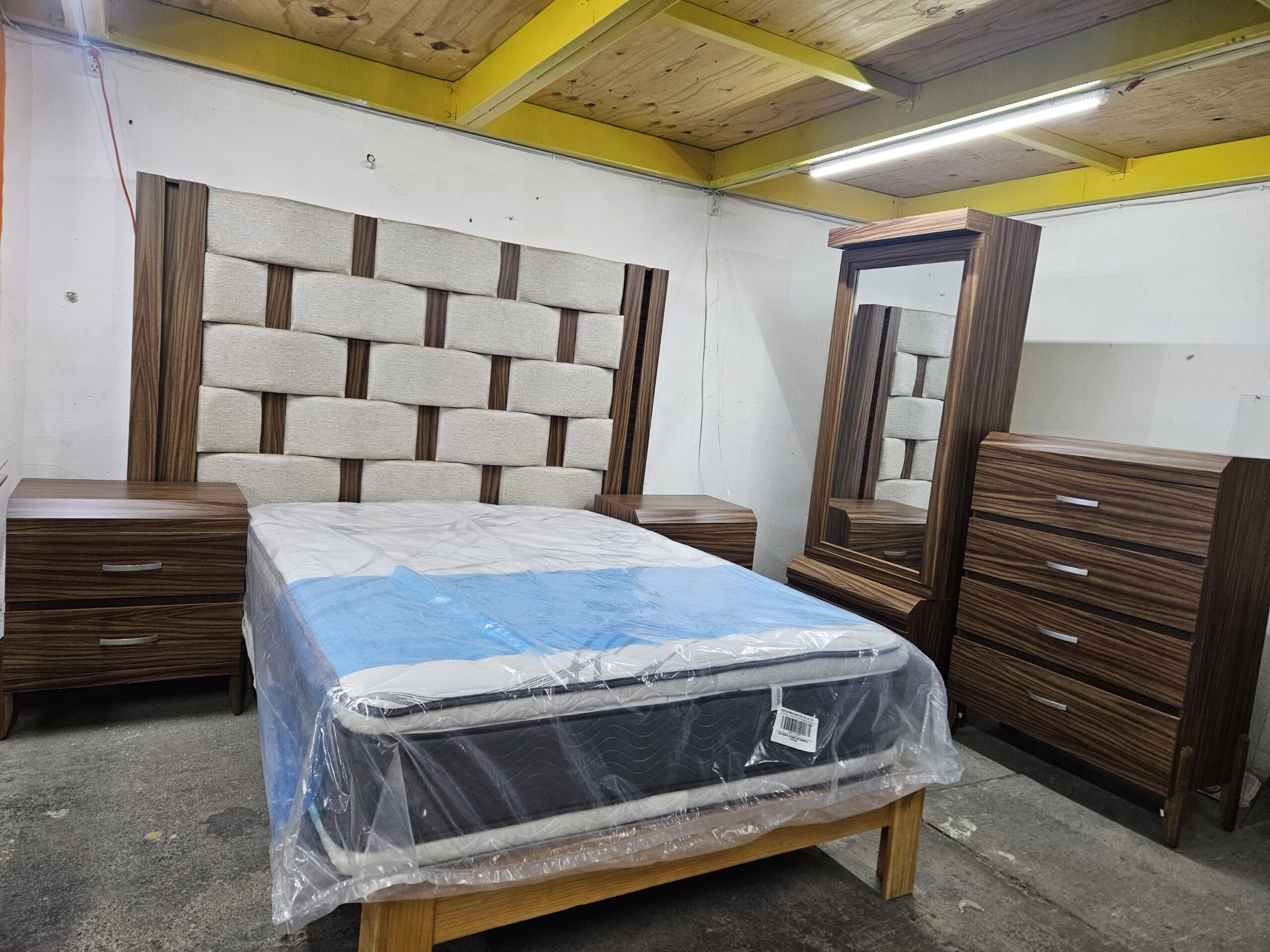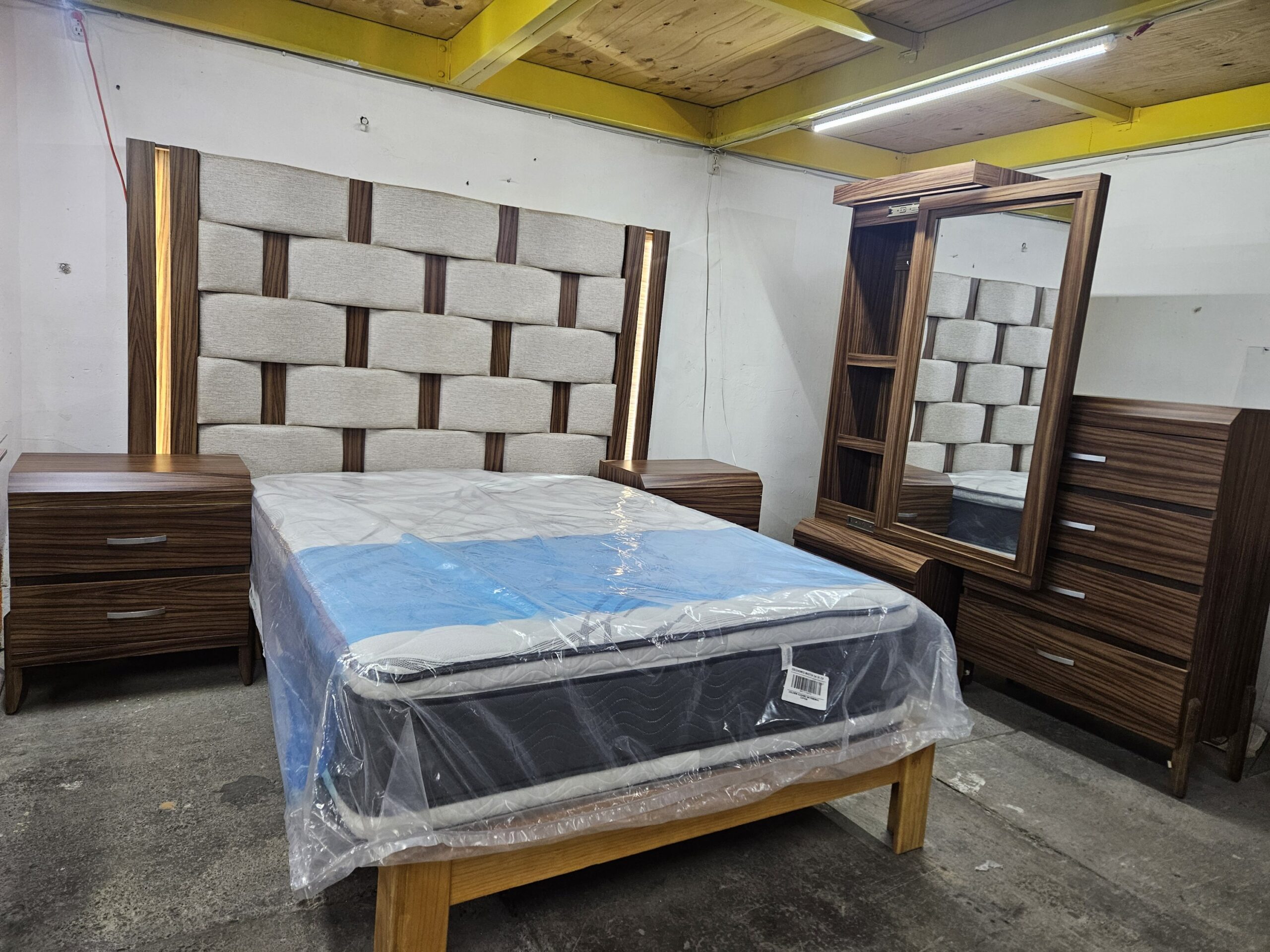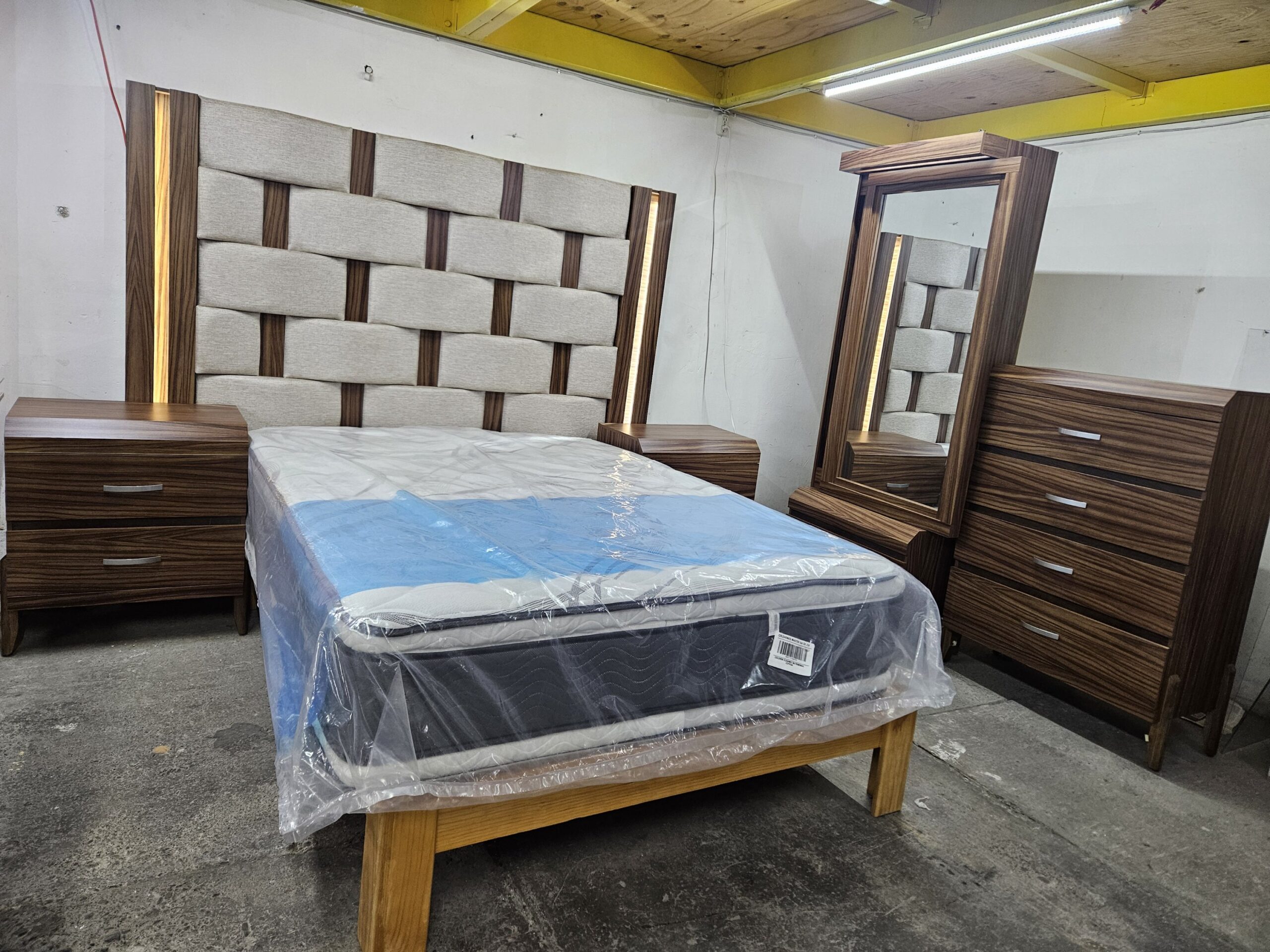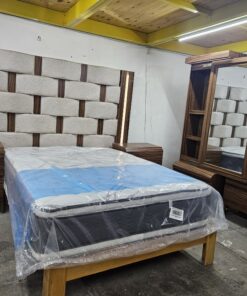 Saltar al contenidoRecámara adaptable para tamaño king size, queen y matrimonial. Consta de cabecera con luz led, par de buros, cajonera y espejo deslizable con luz led.